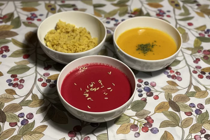 Kürbis-Kurkuma-Suppe, cremige Randen-Suppe und ein klassischer Mung-Dal.