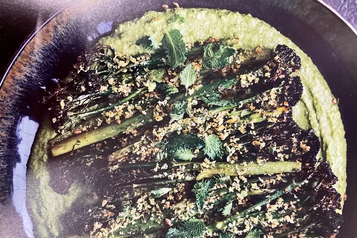 Wilder Brokkoli mit Kräuterbröseln und Pistazien-Hummus