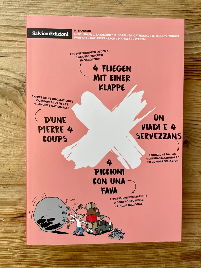Dieses Buch ist eines der wenigen viersprachigen Bücher: Vier Fliegen auf einen Streich! würden wir lokal sagen. Im Buch werden Redewendungen und ihre Metaphern miteinander verglichen, die in unseren Sprachregionen verwendet werden. Ilustratorinnen und Illustratoren bringen diese pointiert zu Bilde.