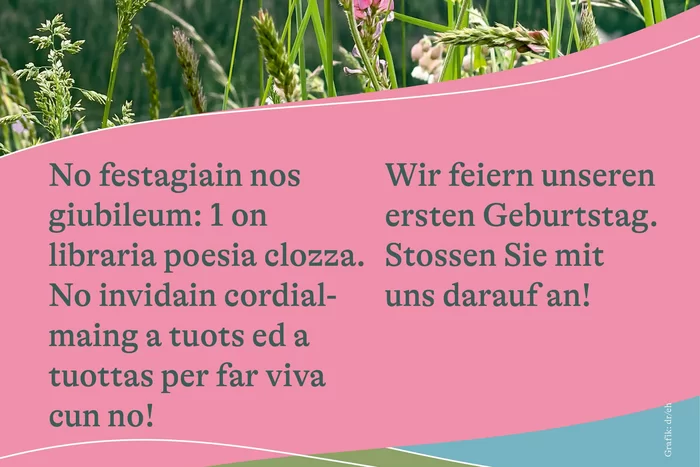 No festagiain nos giubileum: 1 on libraria poesia clozza. No invidain cordialmaing a tuots ed a tuottas per far viva cun no! Portas avertas in dumengia, als 3 da lügl 2022, a partir da las 12 h